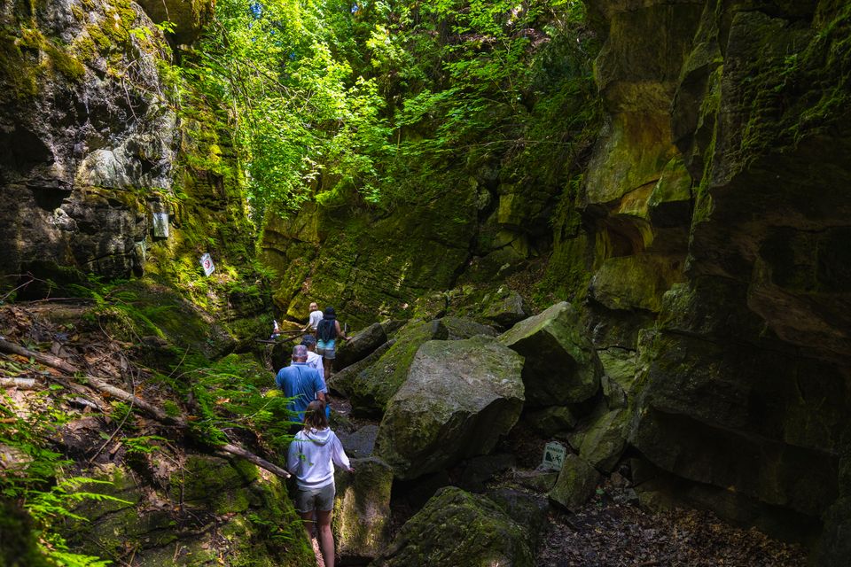 The escarpment creates dramatic terrain by Ontario standards, with forested pathways,