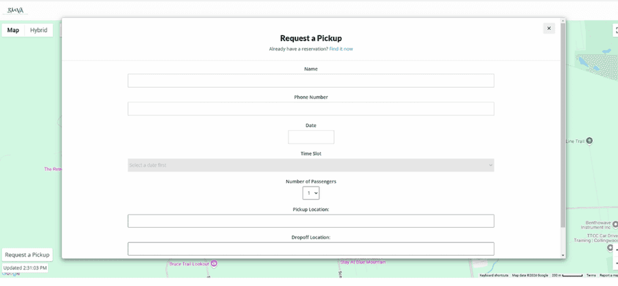 - Enter your name, phone number, time slot, indicate number of passengers, type your pick up location (address will default, use key words; ie: Rivergrass, Snowbridge) and type your drop off location